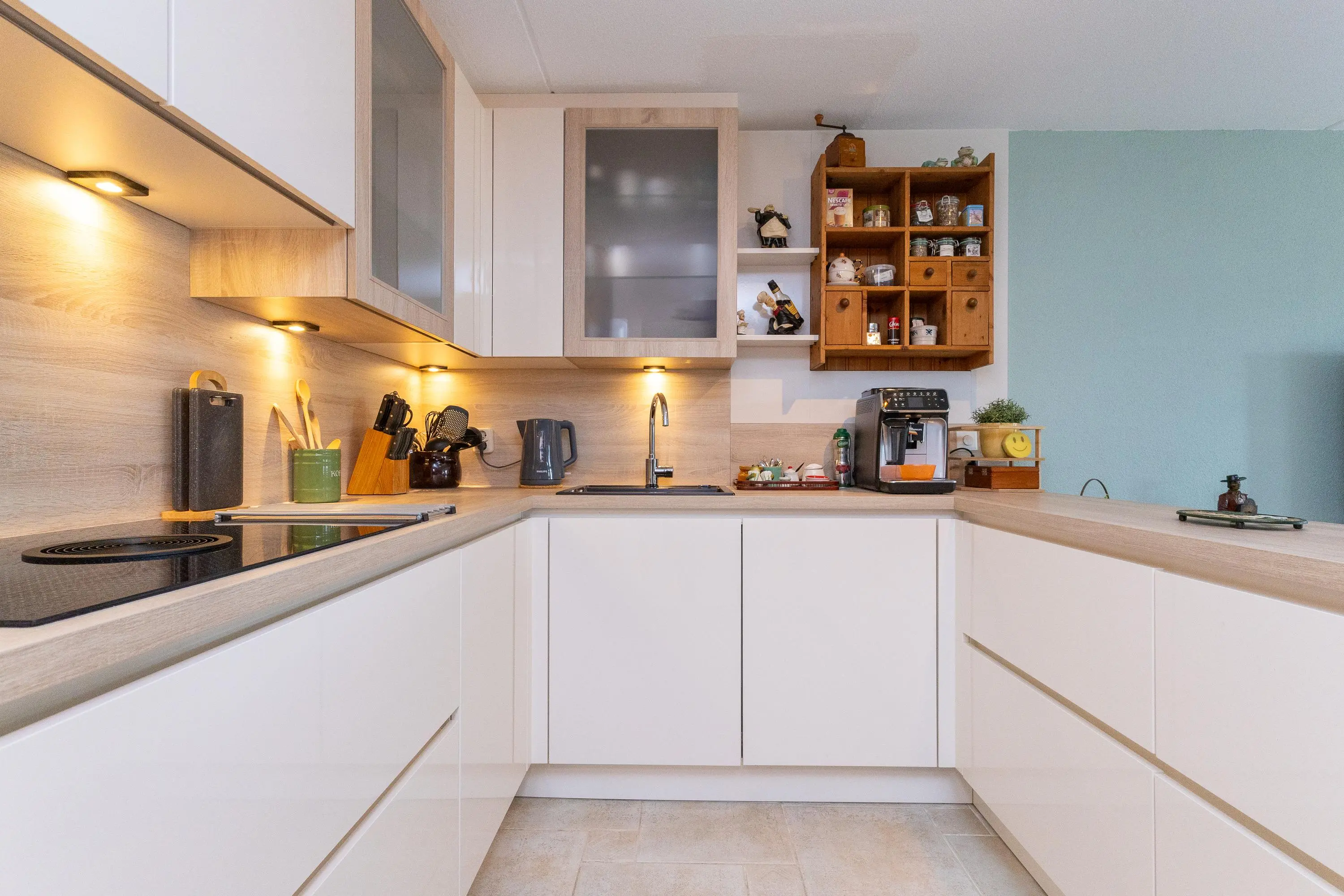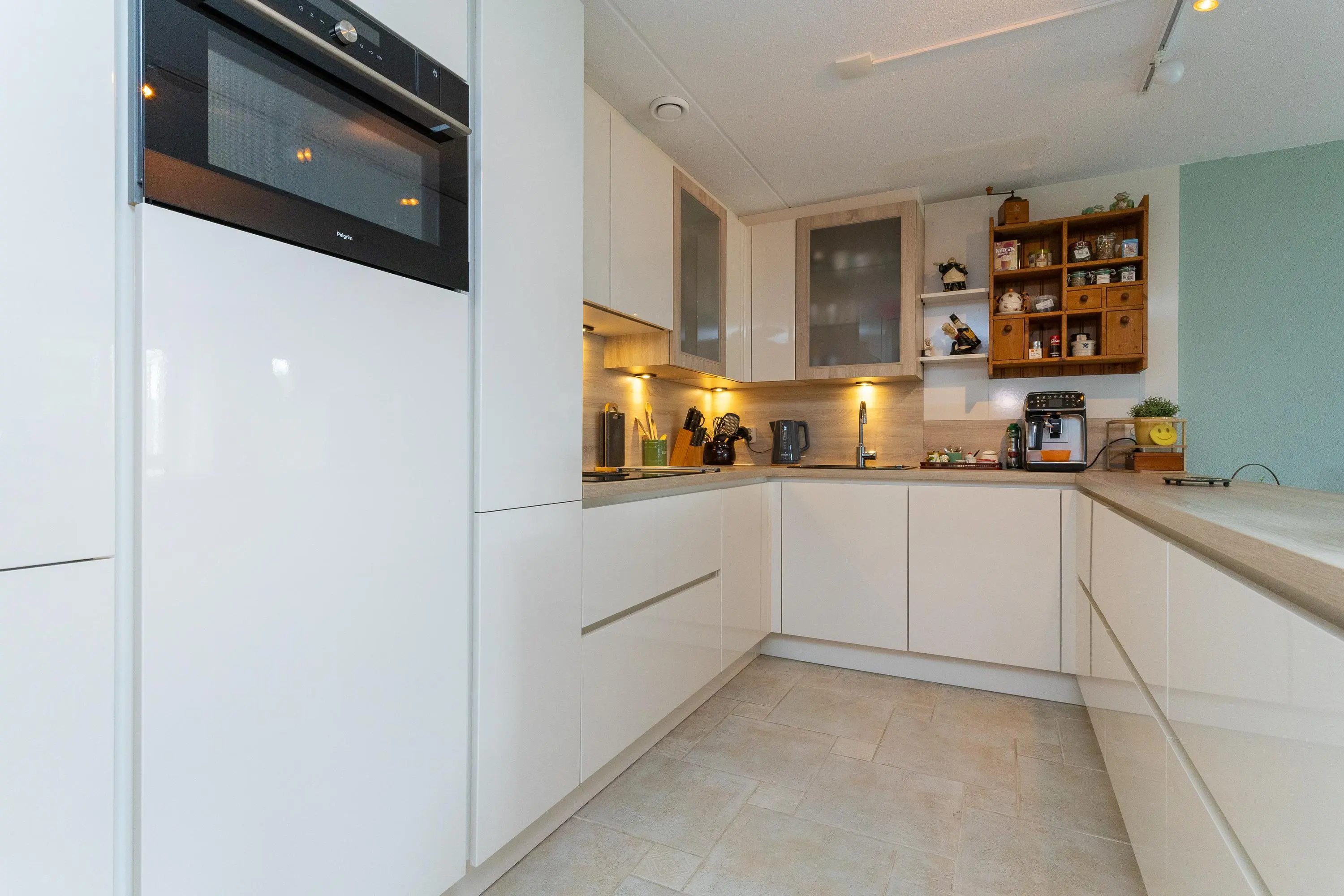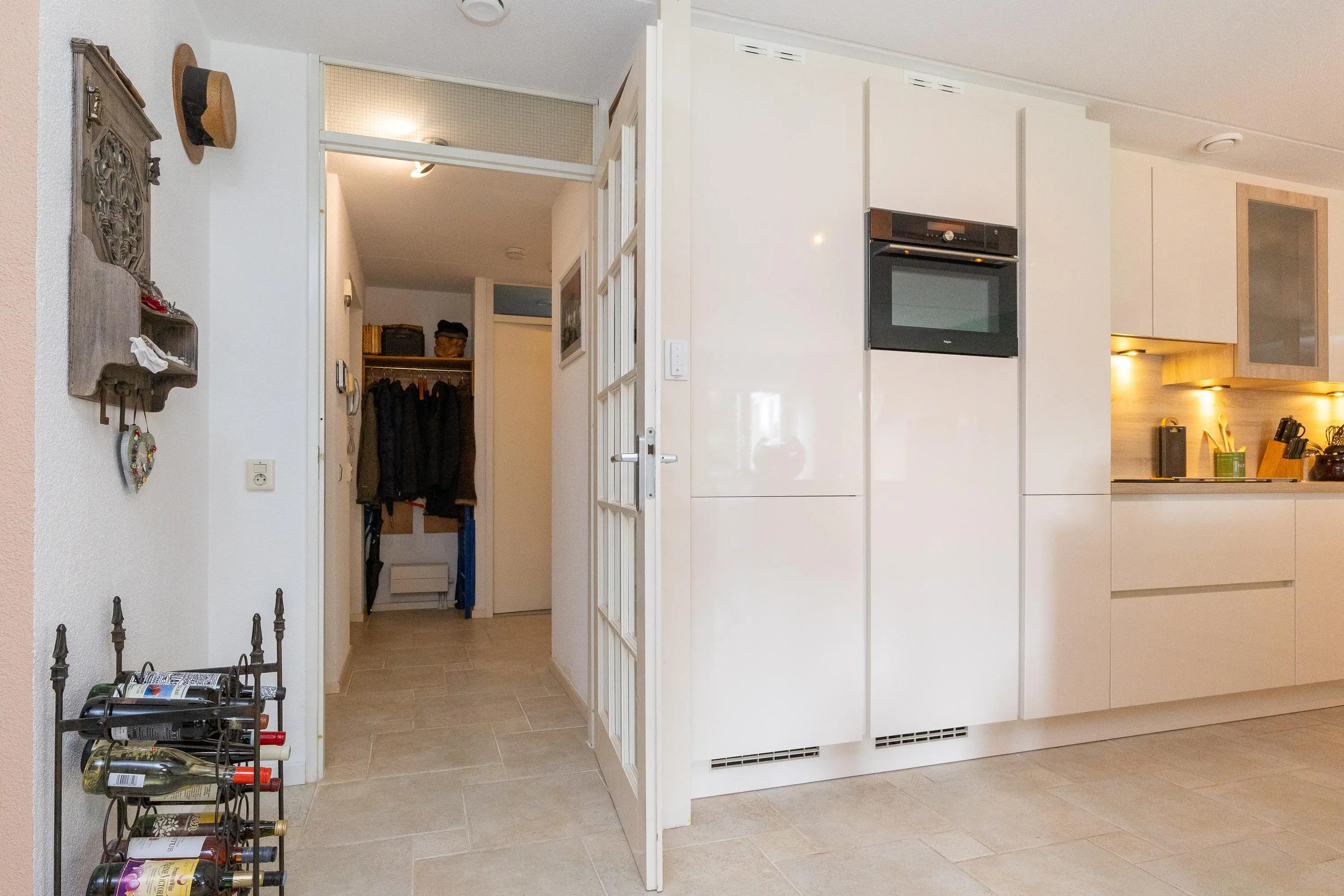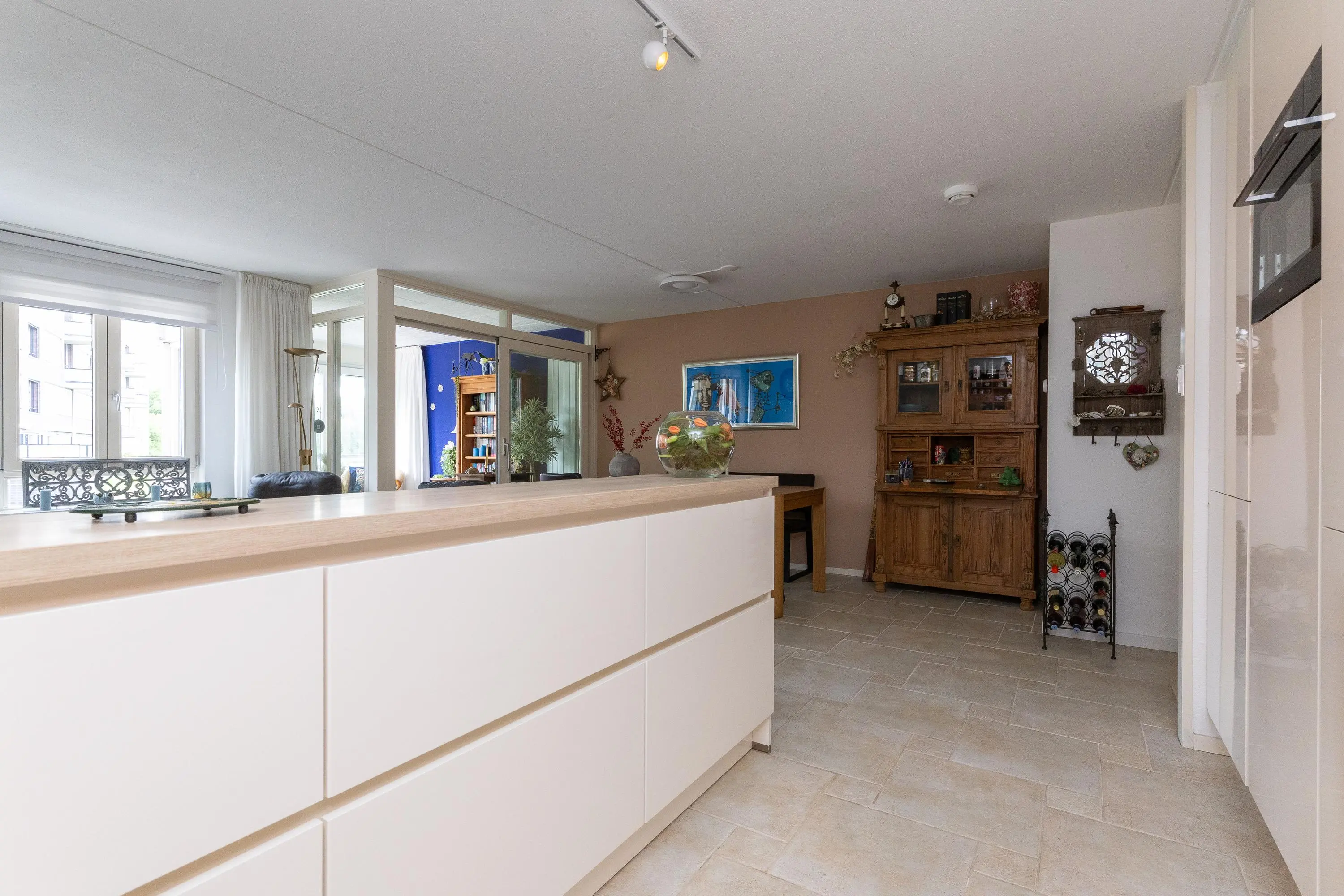 Op de bovenverdieping bevindt zich de lichte en zonnige woonkamer, bereikbaar via een fraaie glasdeur. De woonkamer staat in directe verbinding met de afsluitbare loggia, waar je het hele jaar door prettig kunt zitten: beschut achter glas wanneer het kouder is en met de ramen en vouwdeuren open tijdens warme dagen. De moderne open keuken is niet alleen stijlvol, maar ook zeer functioneel uitgevoerd met hoge werkbladen, veel kastruimte en hoogwaardige inbouwapparatuur, waaronder een Bora kookplaat, extra grote vaatwasser met comfortlift, ruime koelkast en vriezer en een multifunctionele magnetron met oven-, stoom- en grillfunctie.