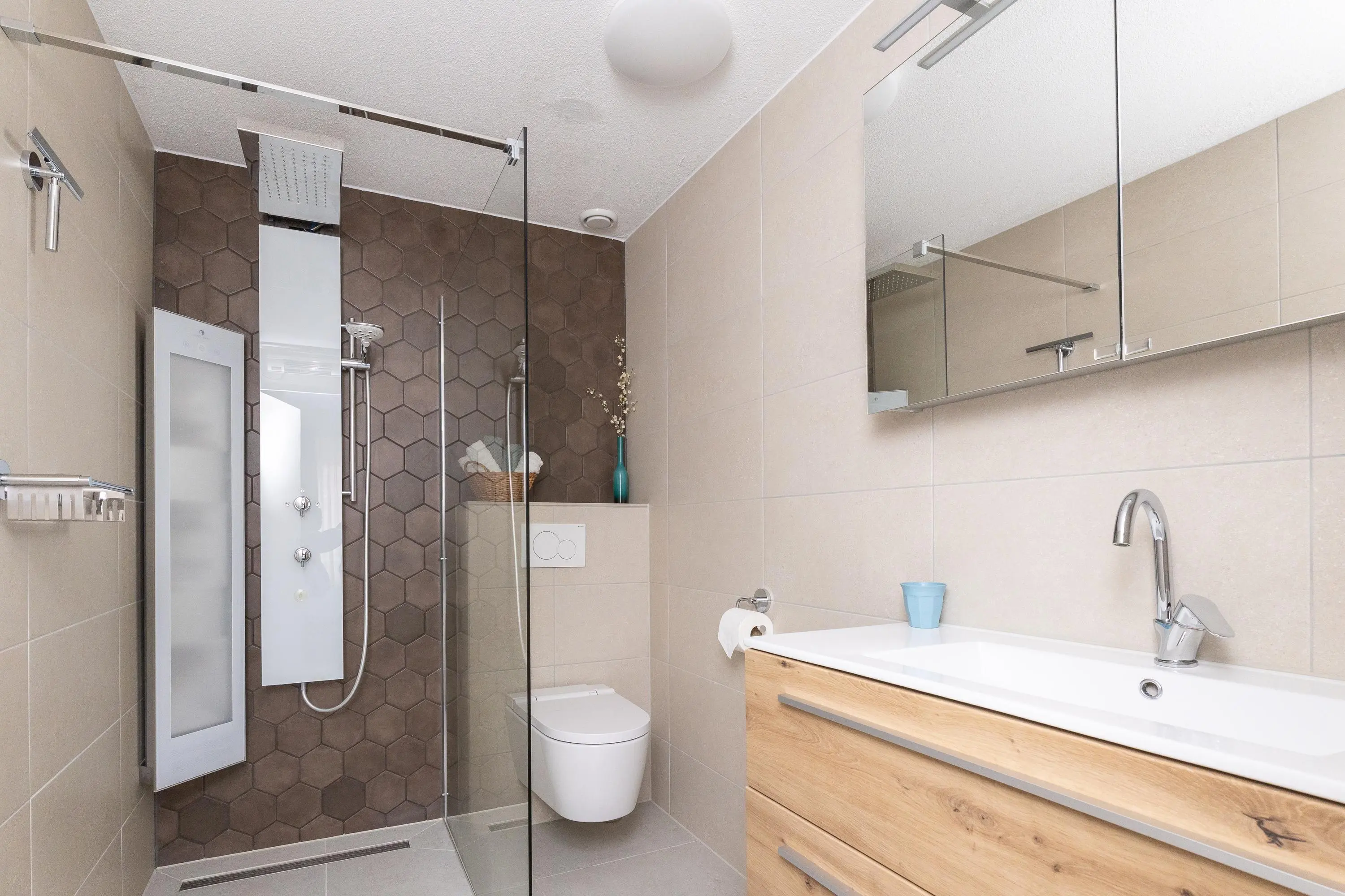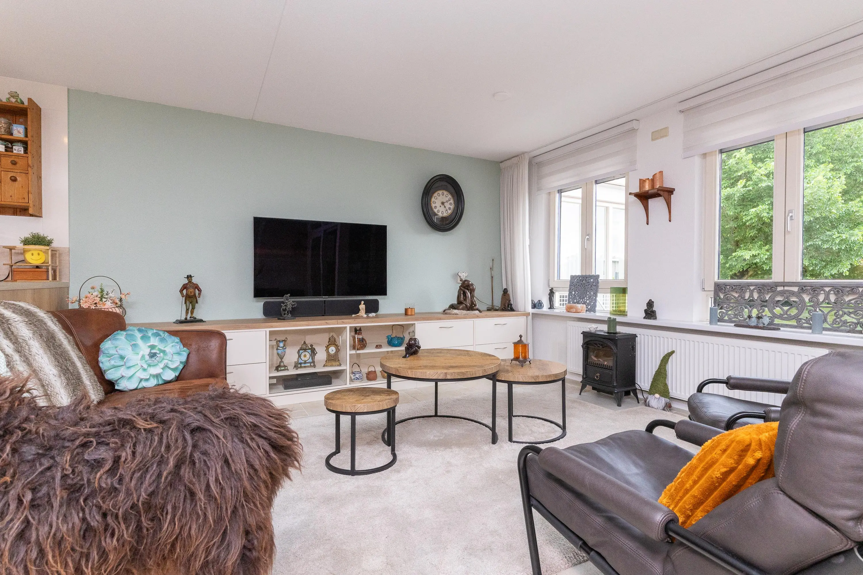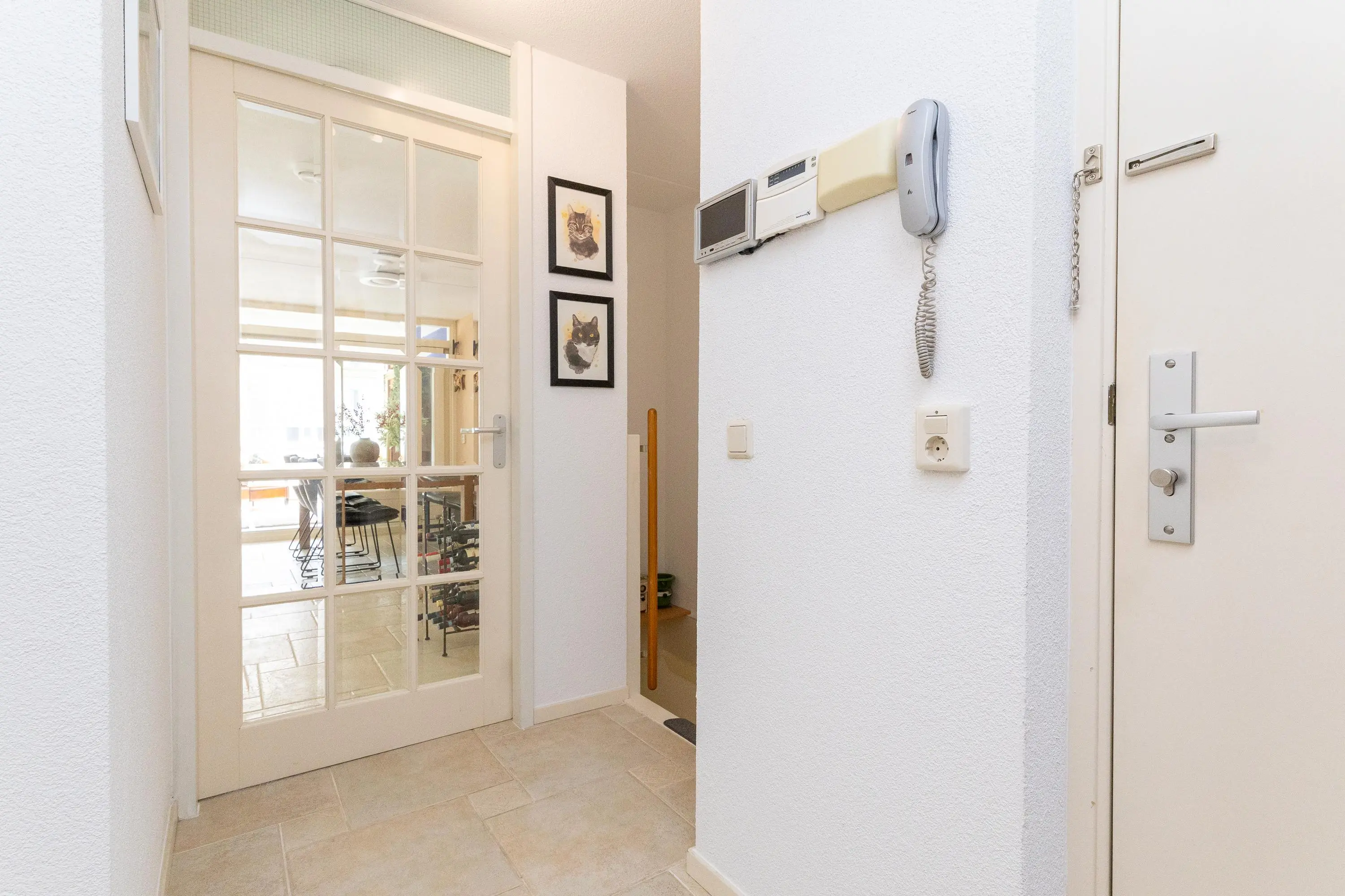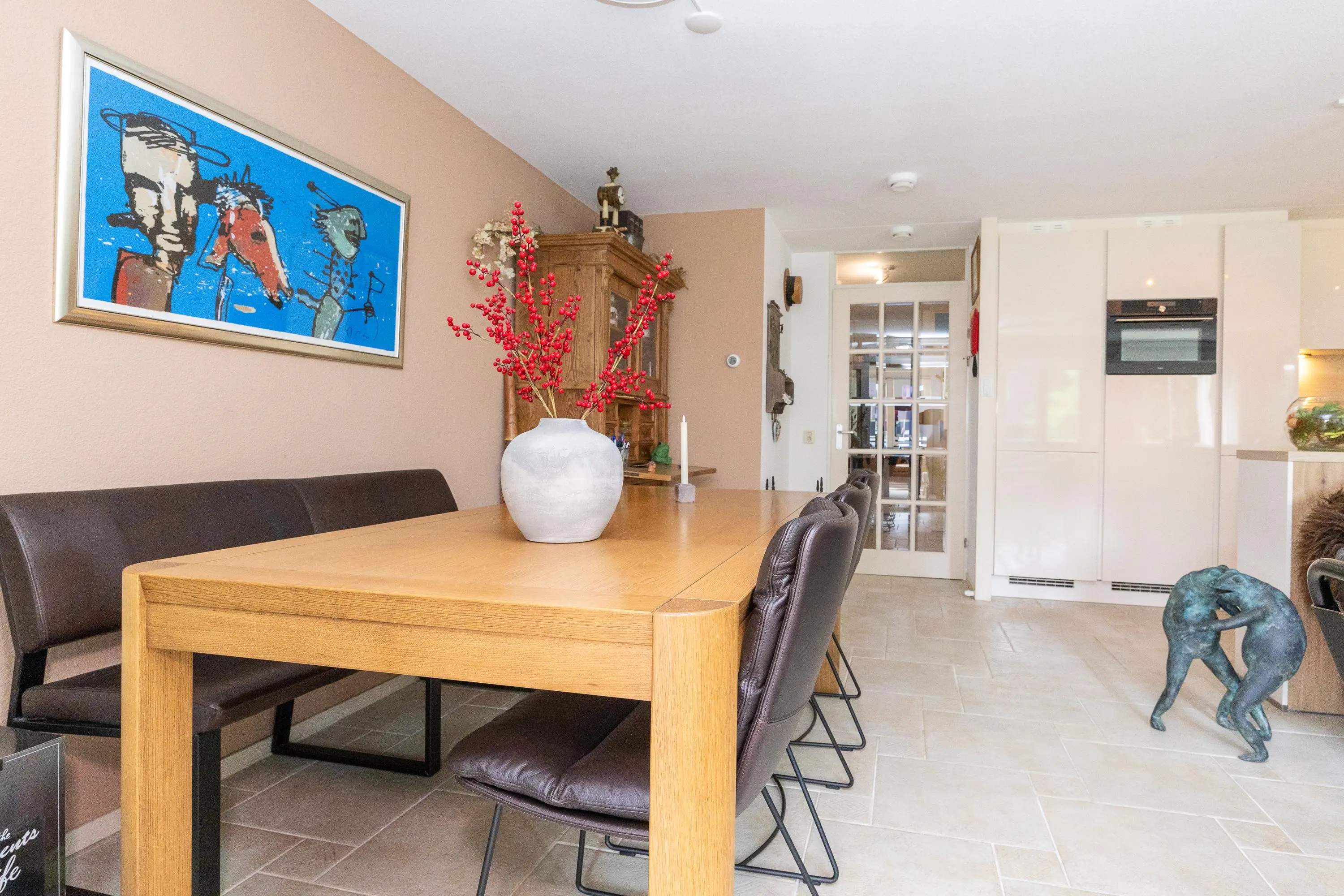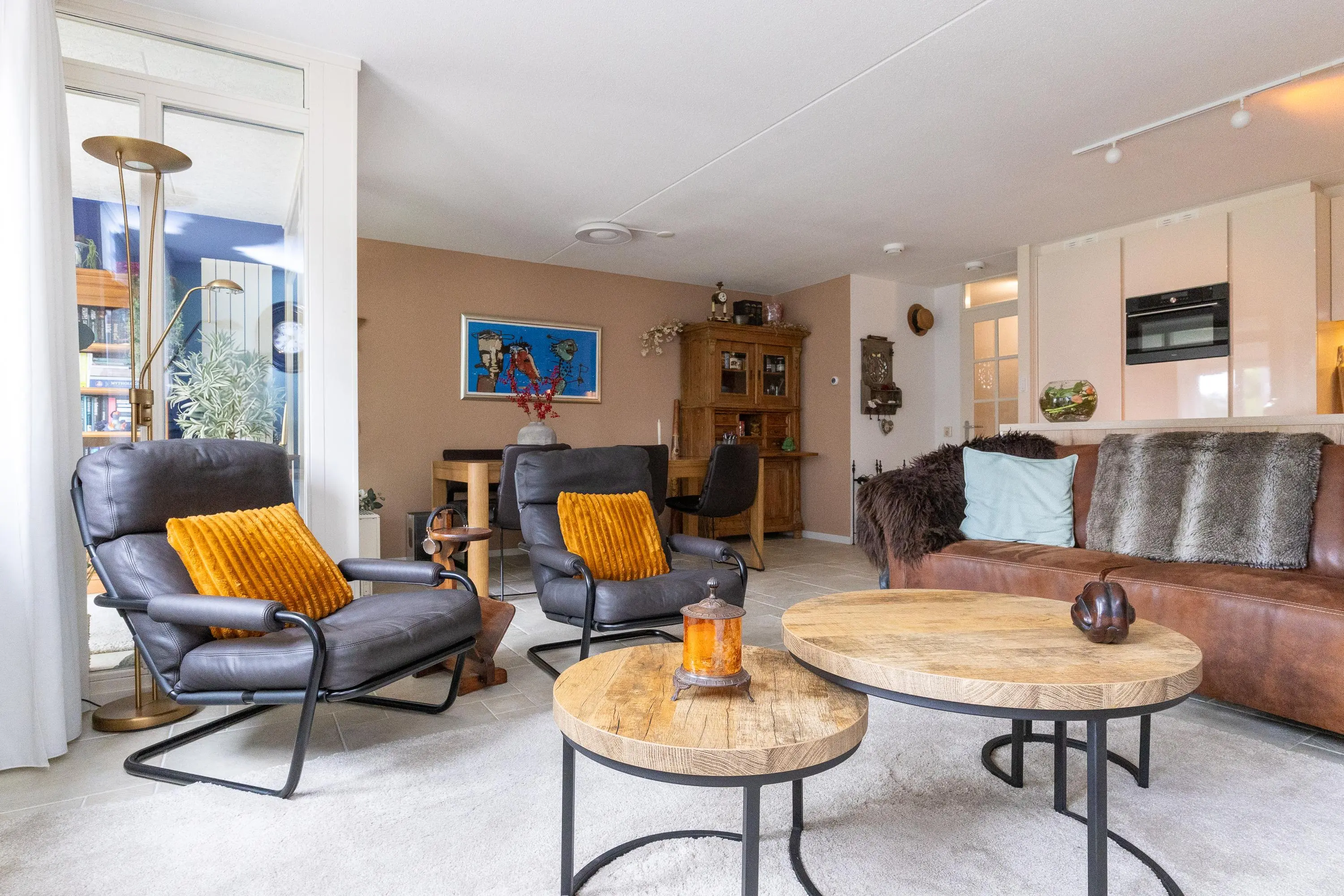 Op de bovenverdieping bevindt zich de lichte en zonnige woonkamer, bereikbaar via een fraaie glasdeur. De woonkamer staat in directe verbinding met de afsluitbare loggia, waar je het hele jaar door prettig kunt zitten: beschut achter glas wanneer het kouder is en met de ramen en vouwdeuren open tijdens warme dagen. De moderne open keuken is niet alleen stijlvol, maar ook zeer functioneel uitgevoerd met hoge werkbladen, veel kastruimte en hoogwaardige inbouwapparatuur, waaronder een Bora kookplaat, extra grote vaatwasser met comfortlift, ruime koelkast en vriezer en een multifunctionele magnetron met oven-, stoom- en grillfunctie.