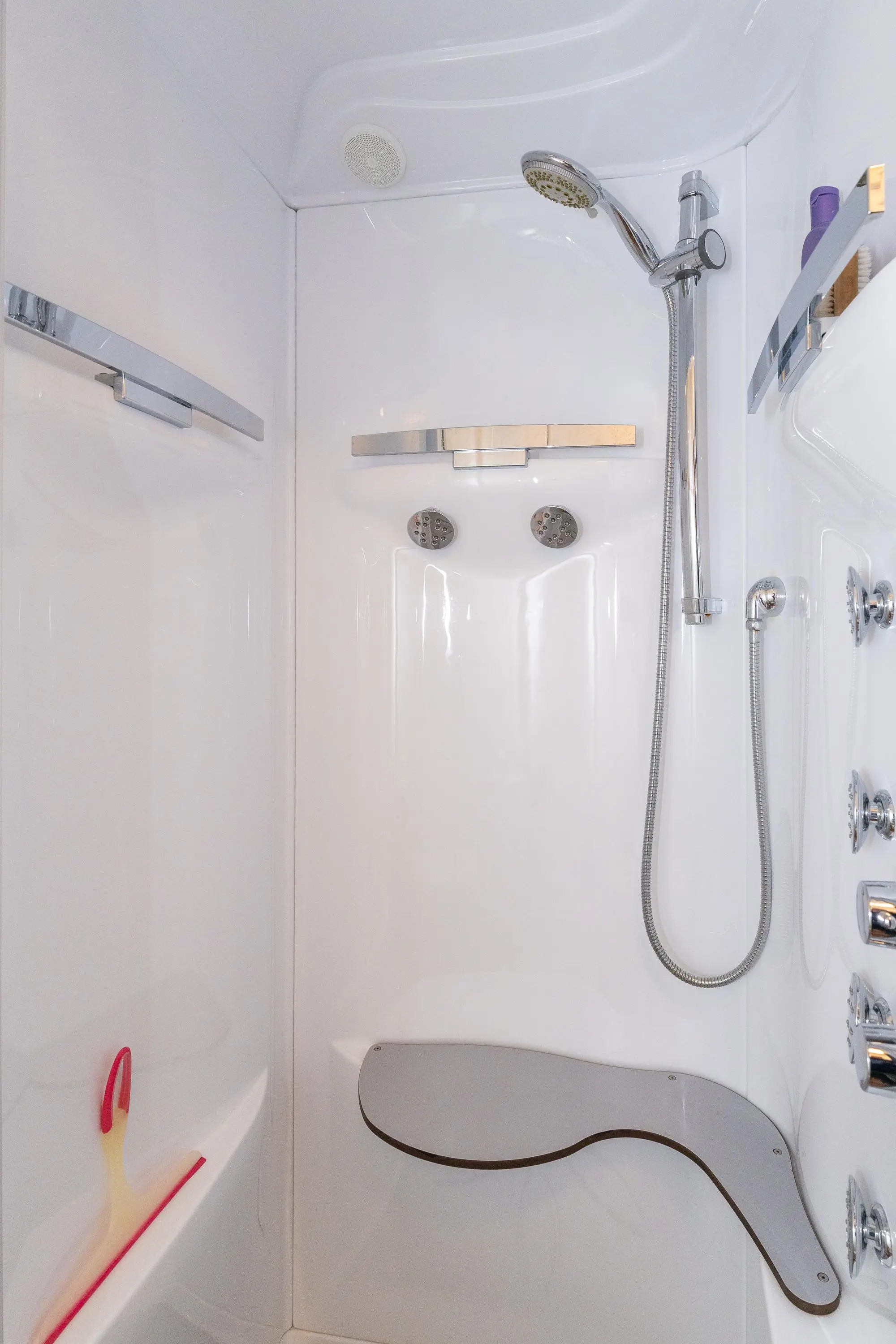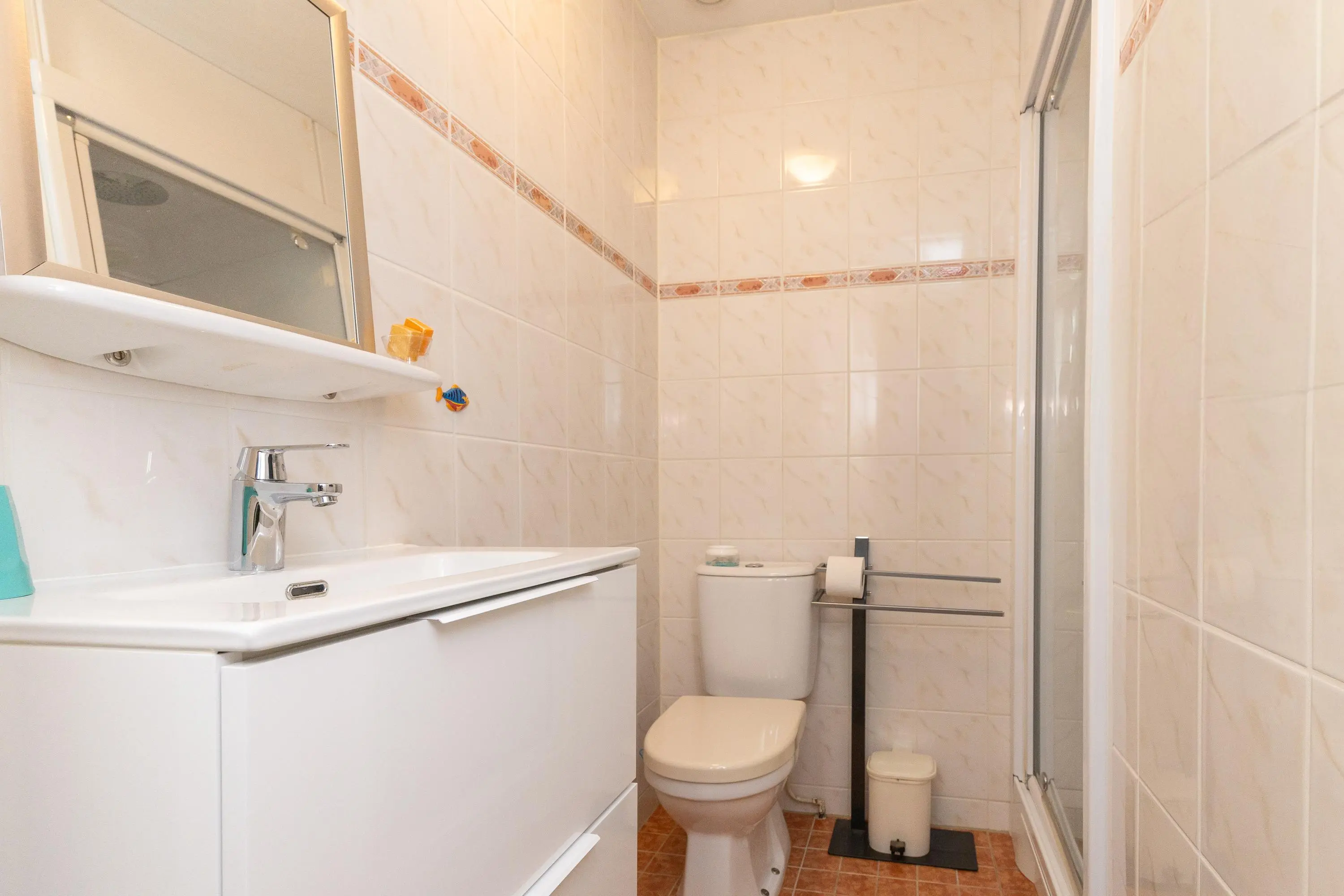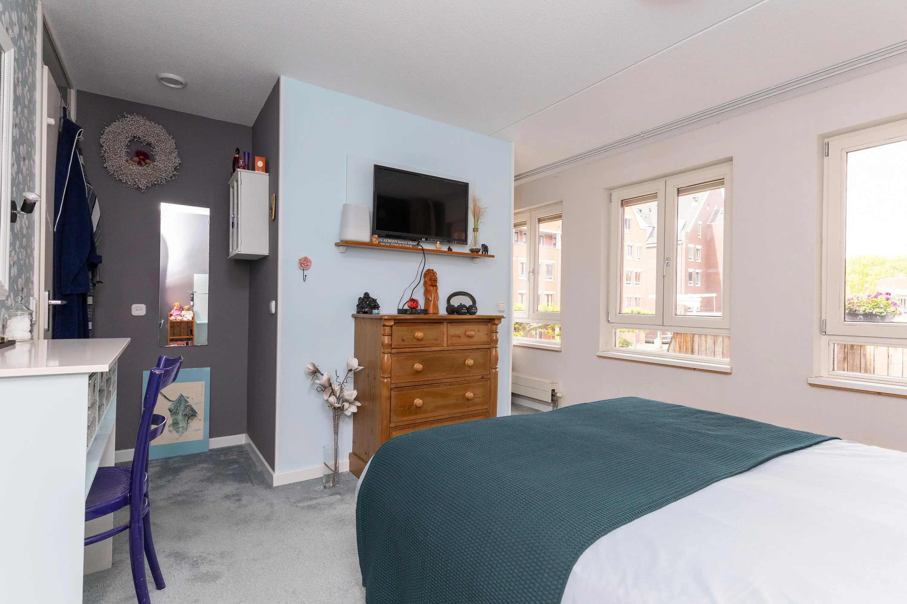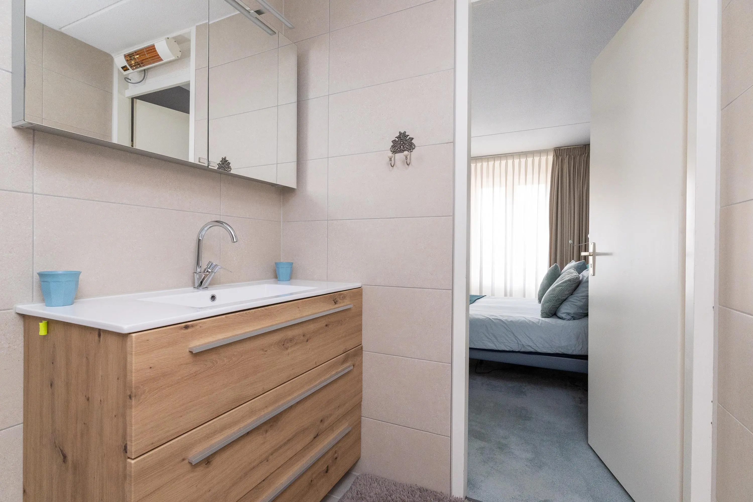 De slaapkamer op deze verdieping ligt aan de rustige binnenzijde van het complex en beschikt over een directe verbinding met de luxe badkamer. Deze is voorzien van een modern badmeubel, comfortabel douchetoilet, stortdouche en eventueel een sunshower. Aansluitend bevindt zich een royale inloopkast met veel bergruimte.